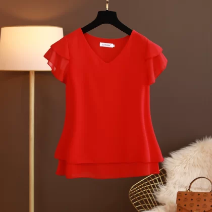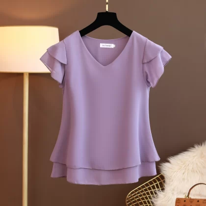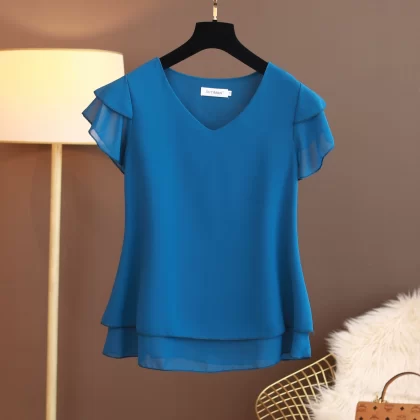 قميص شيفون أوروبي بأكمام قصيرة ورقبة على شكل حرف V يغطي البطن