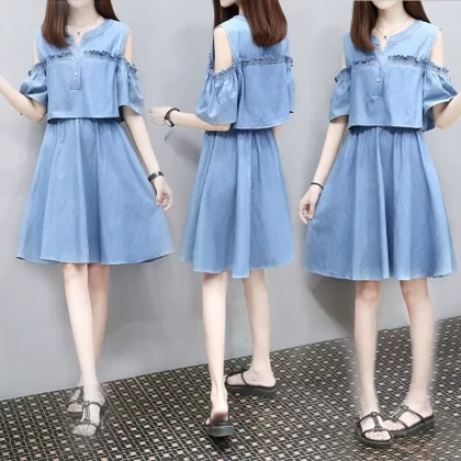 | nameOriginal | European station 2024 summer Korean style casual fairy skirt bottoming skirt off-shoulder denim fake two-piece cold style dress |