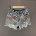 European station letter shorts summer high waist raw edge hot rhinestones