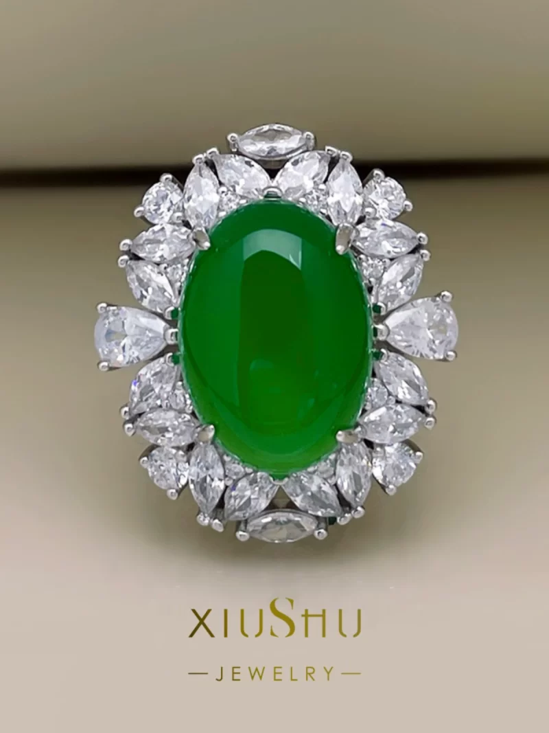 nameOriginal | Exploding Ice Brazilian Large Pigeon Egg Chrysoprase Luxury Ring Comparable to Jadeite 925 Sterling Silver High Fluorescence 53 |