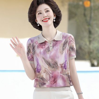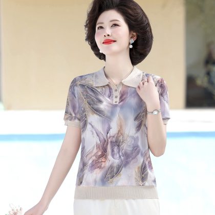 Explosions mother summer short sleeve ice silk T-shirt 2024 new middle-aged and elderly women's fashion lapel thin foreign style top