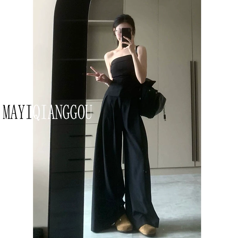 بنطال طويل جدًا أسود اللون فضفاض ومستقيم بخصر عالٍ وواسع الساق