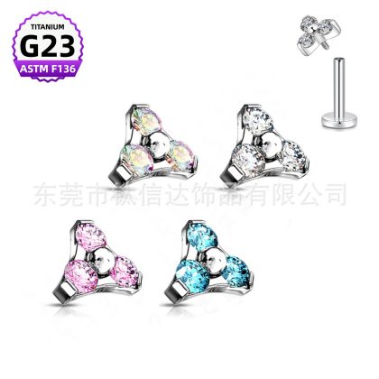 F136 titanium ear studs inner teeth triangle flower bag inlaid zircon lip nail G23 titanium alloy body piercing jewelry ear bone nail