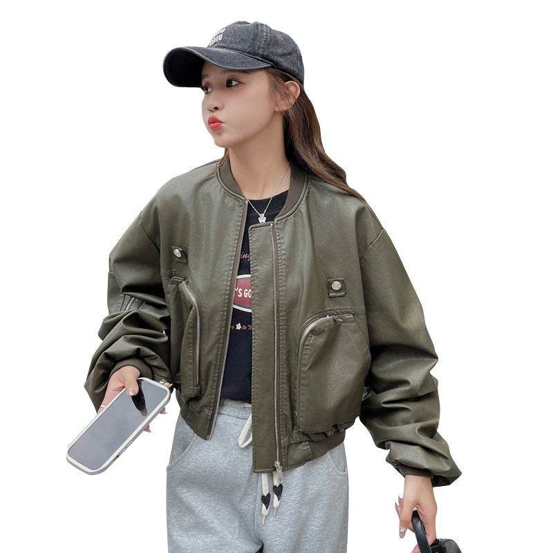 Factory Army Green Short Leather Jacket Women's Spring and Autumn 2024 New Arrival Hong Kong Style Petite Fried Street pu Leather Jacket Trendy