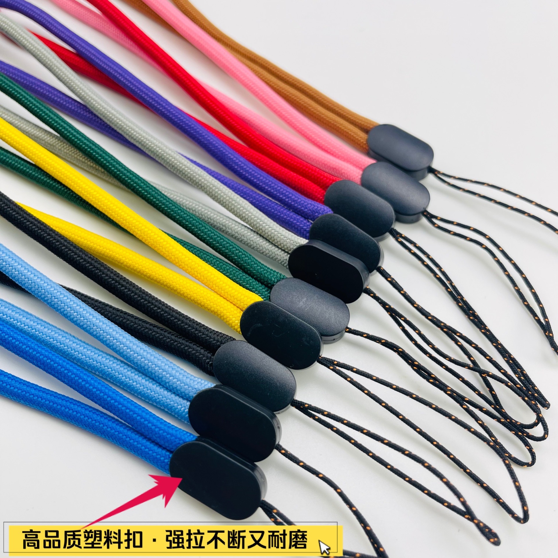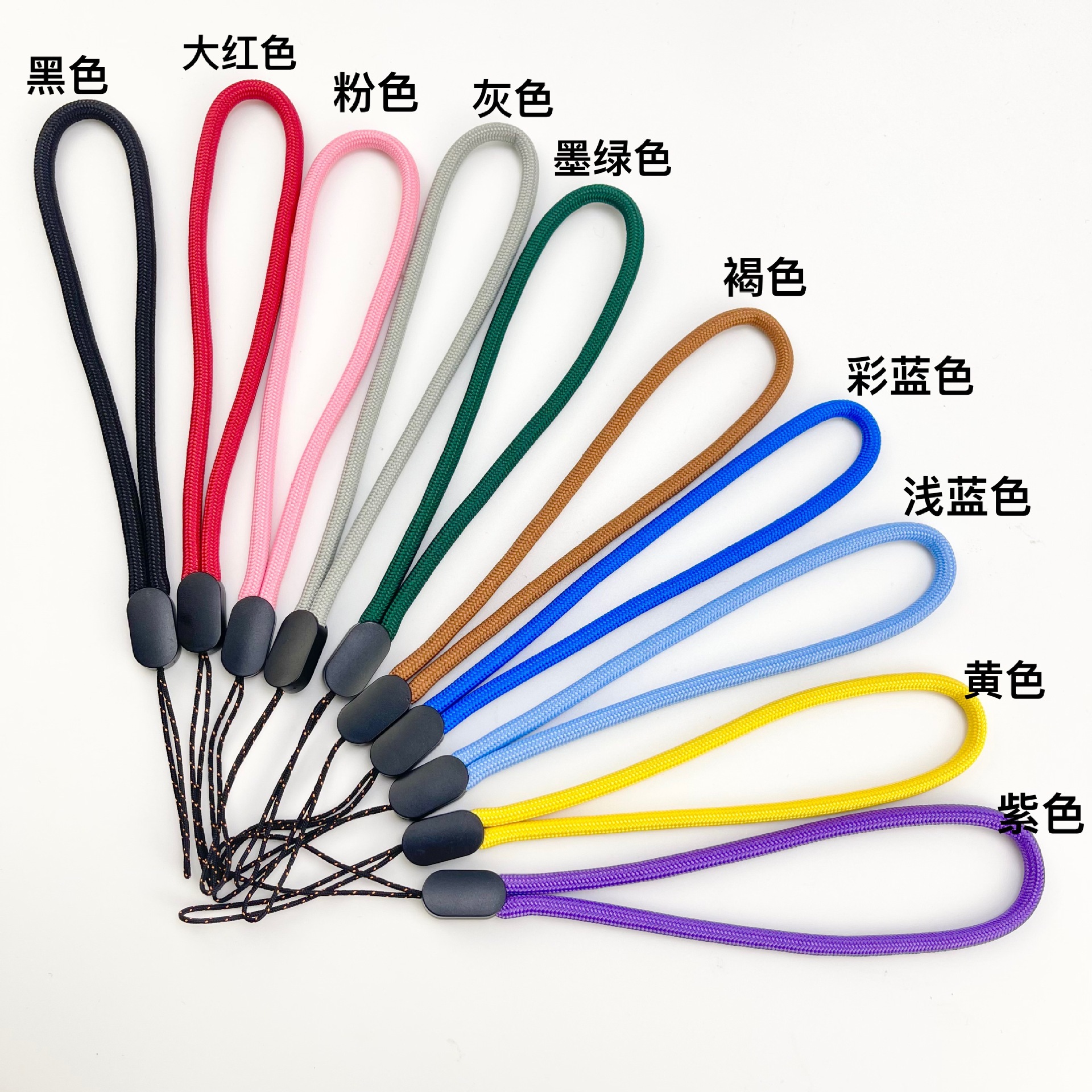 | nameOriginal | Factory direct simple personality solid color 4.5 round rope mobile phone lanyard flashlight small fan kettle exhibition brand short |