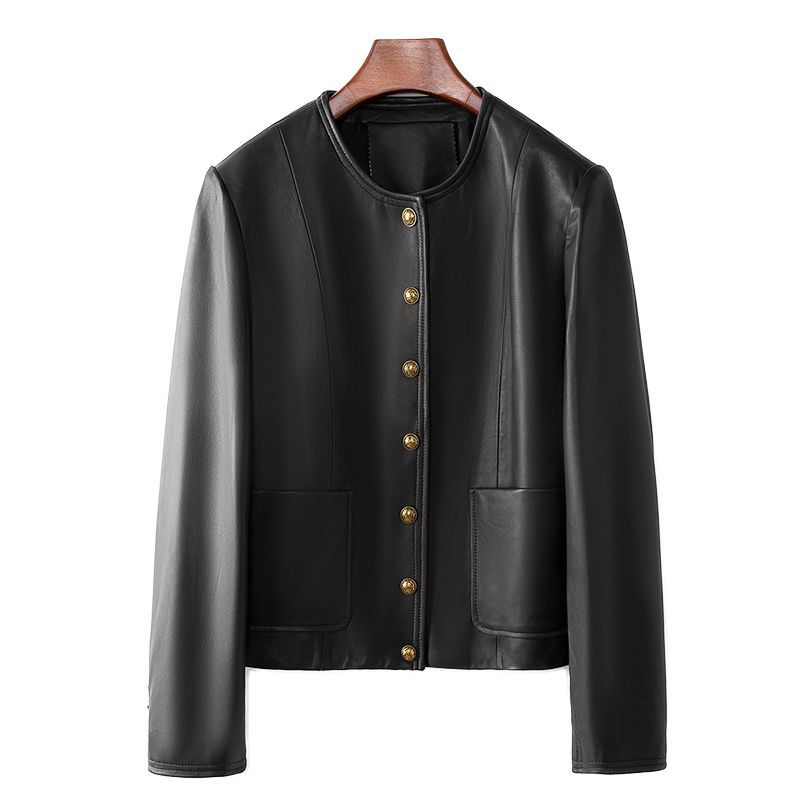 Factory spot 100 sheep skin 2024 Haining spring new women's round neck small fragrance style leather coat