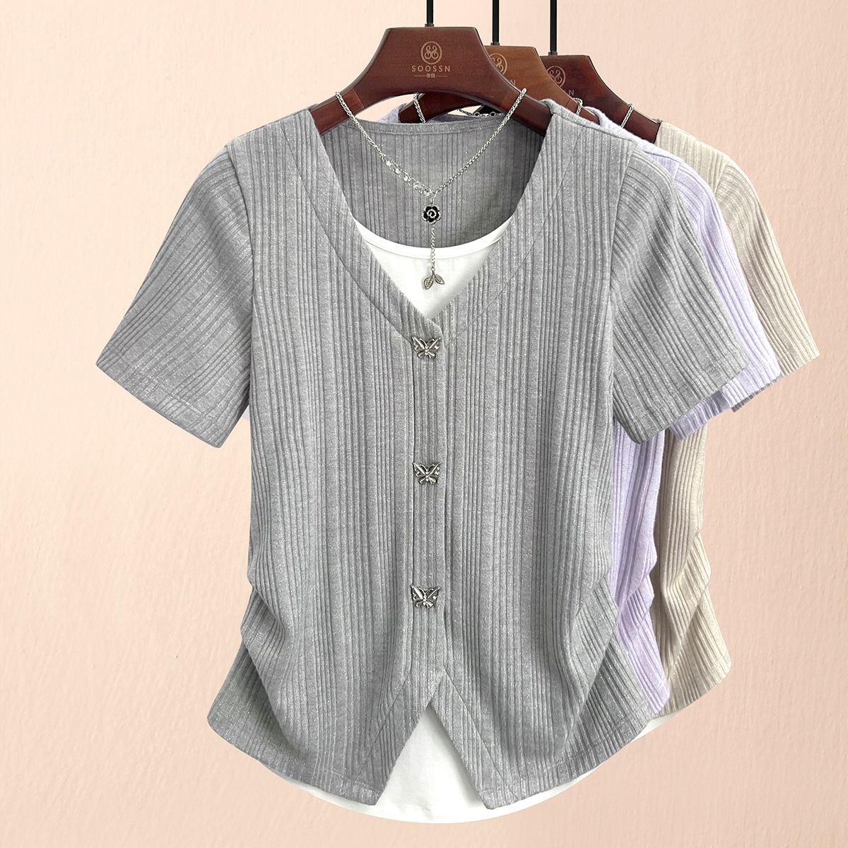 | nameOriginal | Fake Two-piece Round Neck Short-sleeved T-shirt Women's Irregular Design Sense 24 Summer New Slimming Stretch Pleated 1688 Top |