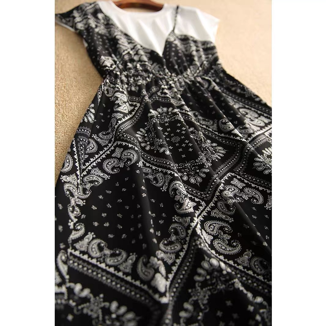Fake Two-piece Short-sleeved Dress Women's Summer New Arrival Stitching Artistic Elegant Casual Printed Slim-waisted A- line Dress