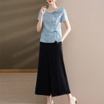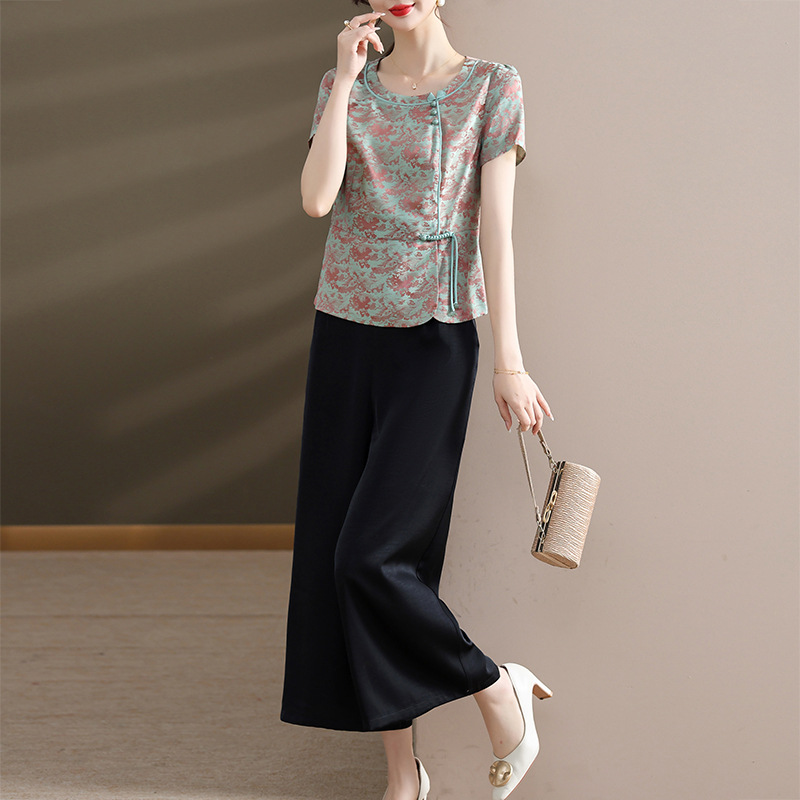 موضة رداء غير رسمية المرأة 2024 صيف جديد النمط الوطني الجولة الرقبة مشبك الشيفون قميص صغير واسعة الساق السراويل قطعتين مجموعة العصرية