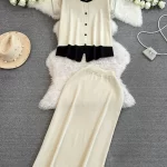 Fashion suit for women 2024 spring and summer short-sleeved contrasting color round neck knitted jacket two-piece set high waist hip skirt