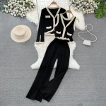 | nameOriginal | Fashion suit for women in autumn and winter contrasting color long-sleeved V-neck single-breasted knitted jacket vest high-waisted straight wide-leg pants |