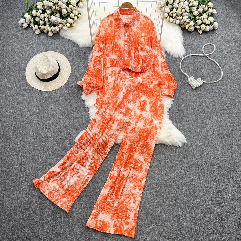| nameOriginal | Fashion suit for women, Korean version, lantern sleeves, loose single-breasted, smudged print shirt, three-piece set, high-waisted, wide-leg pants |
