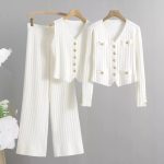 | nameOriginal | Fashion suit Women's 2024 Autumn New Metal Buckle Vest All-match Knitted Cardigan High Waist Wide Leg Pants Three-piece Set |