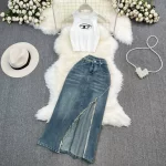 Fashionable suit for hot girls, halterneck, off-shoulder, slim-fitting vest, two-piece set, high-waisted, mid-length, slit denim skirt