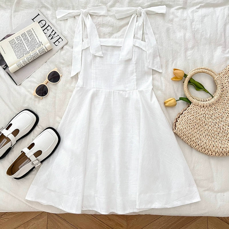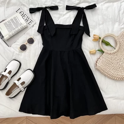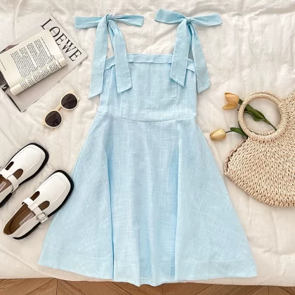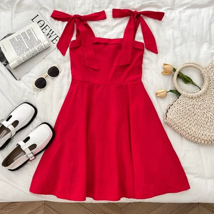 فستان أنيق وحلو ومتعدد الاستخدامات برباط على شكل فيونكة عالي الخصر وتنورة قصيرة على شكل حرف a للنساء صيفي بنمط جديد