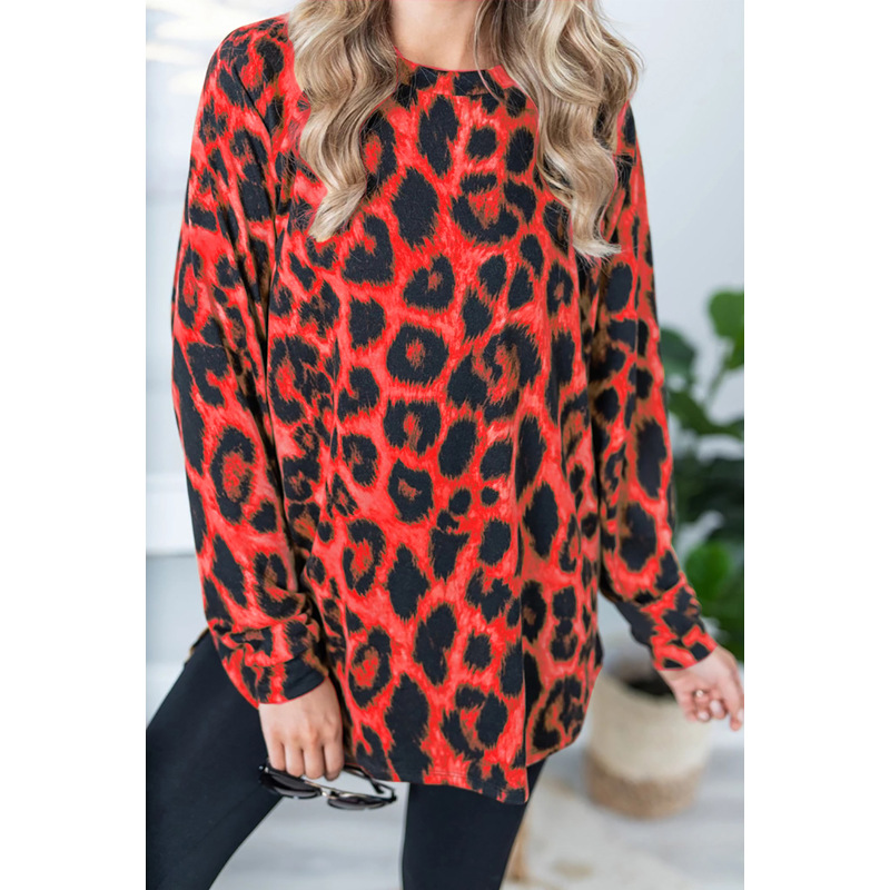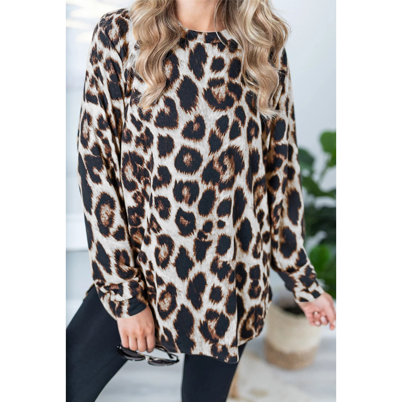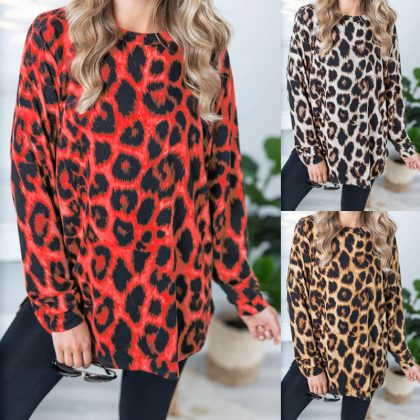 FC759 سبوت 2022 خريف جديد المرأة الأوروبية والأمريكية ليوبارد طباعة فضفاض البلوز كم طويل تي شيرت المرأة