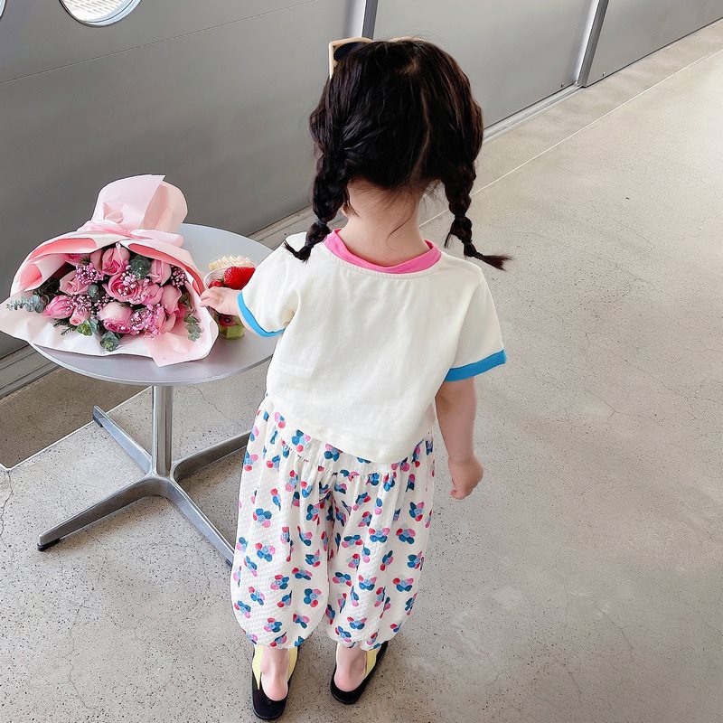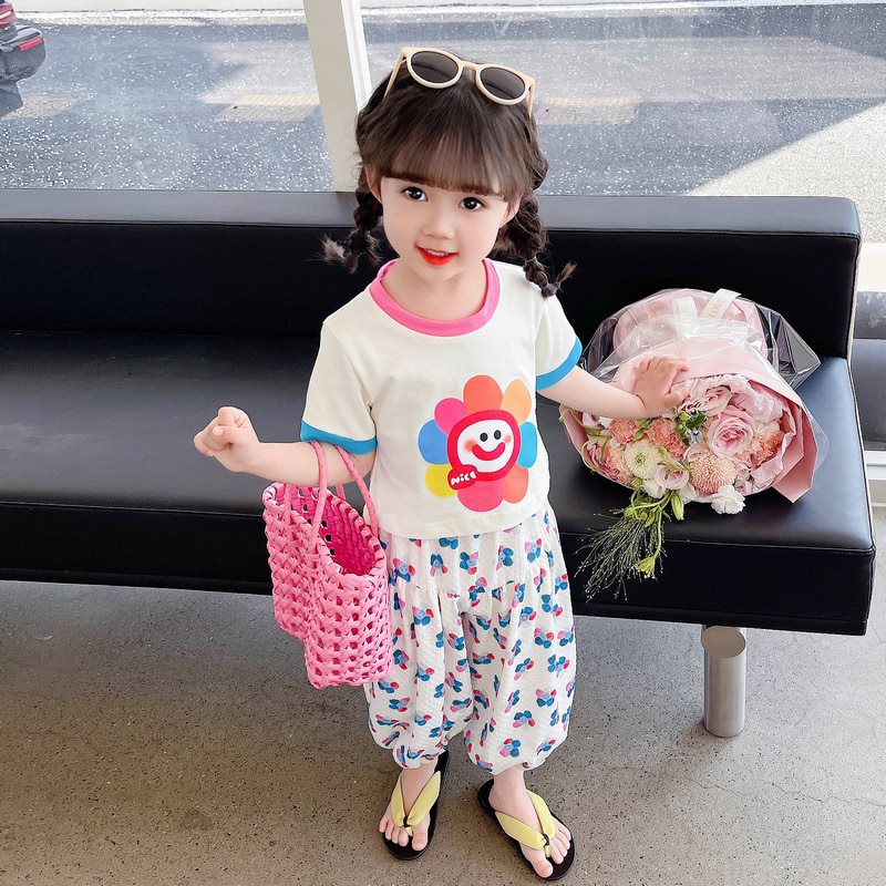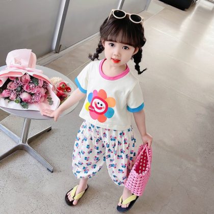 أنثى. بدلة عباد الشمس الملونة للأطفال صيف جديد للأطفال بأكمام قصيرة مطبوعة مضادة للبعوض طقم غير رسمي مكون من قطعتين