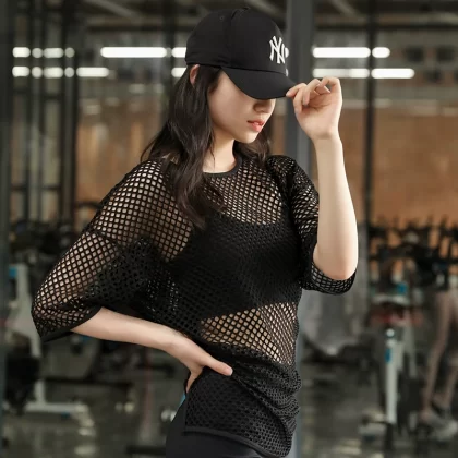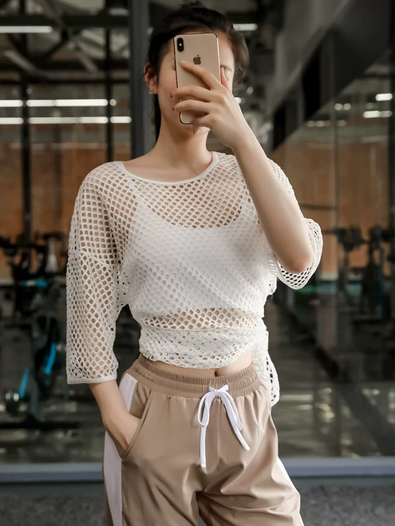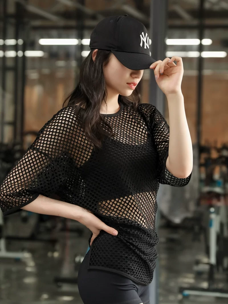 Fitness clothing, feminine, large mesh hollow blouse, large T-shirt, loose sports top, casual fishnet see-through ins