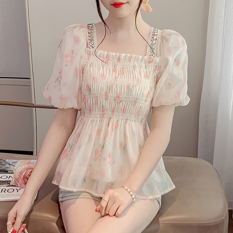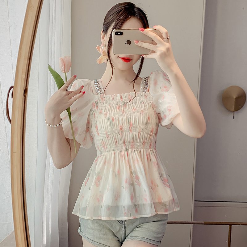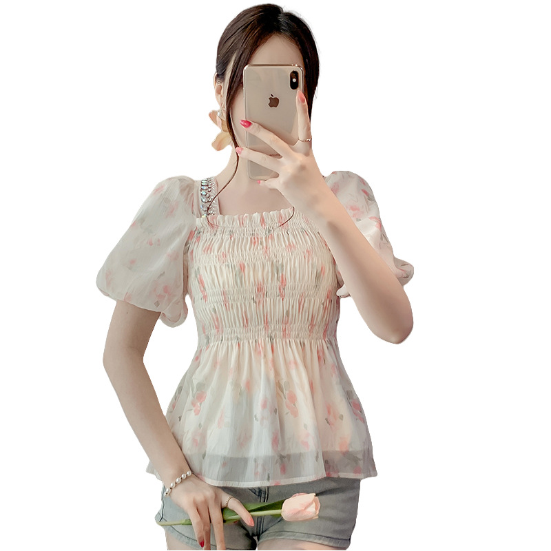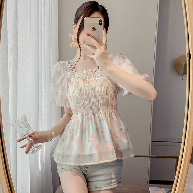 Floral Chiffon Short-sleeved Shirt 2024 New Women's Summer Stylish Small Shirt Tight Waist Belly Covering Beautiful Top