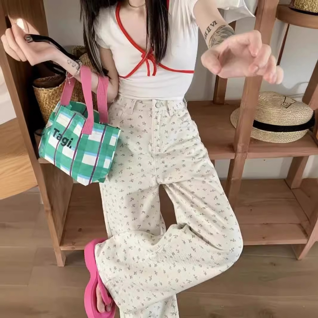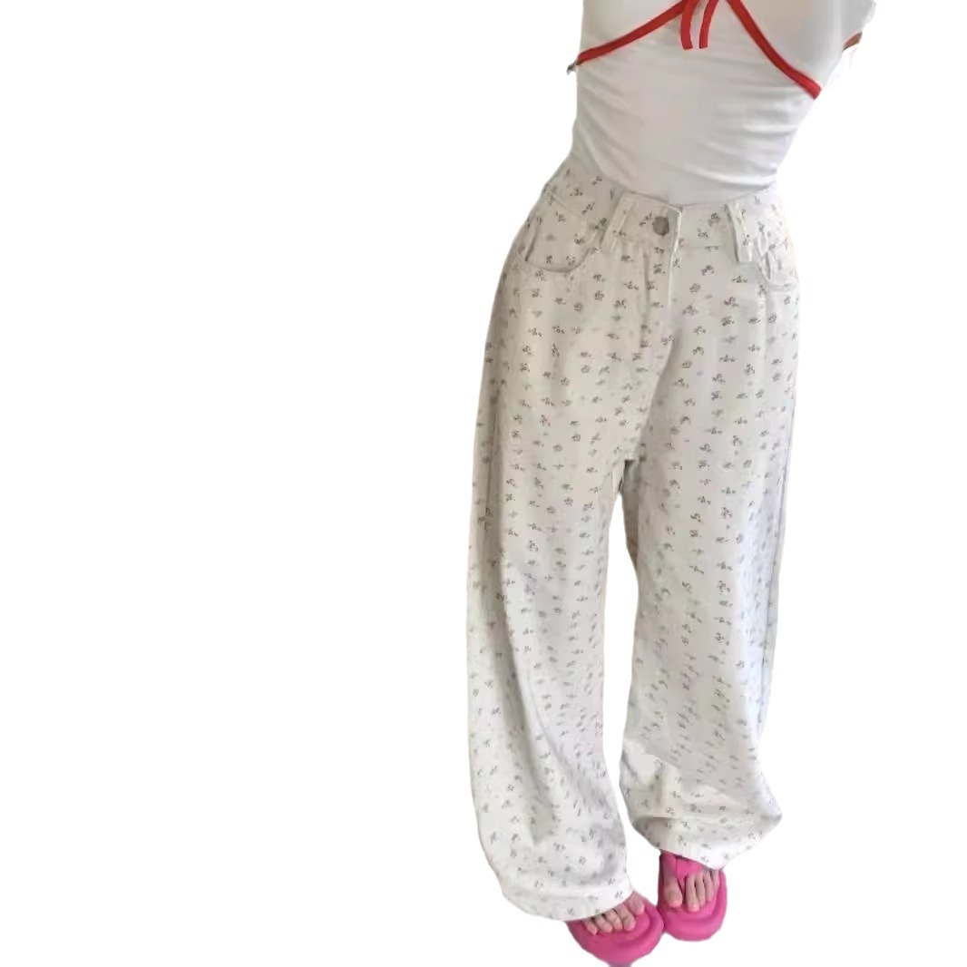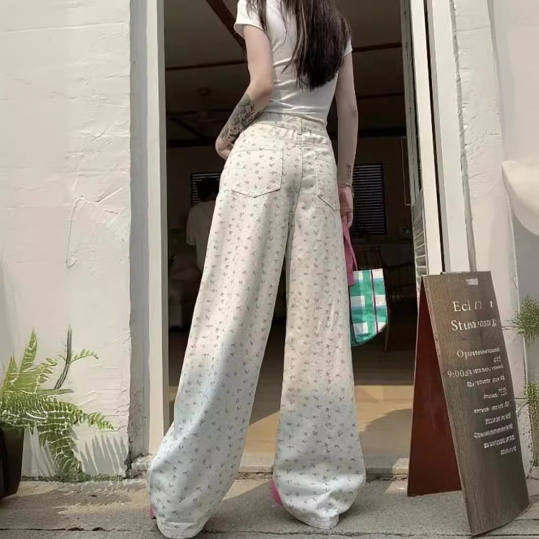 | nameOriginal | Floral Design Sense Casual Jeans Women's Summer New American Style High Waist Slimming Straight Loose Wide Leg Long Pants |
