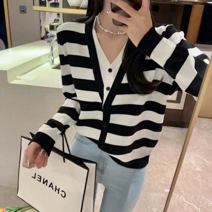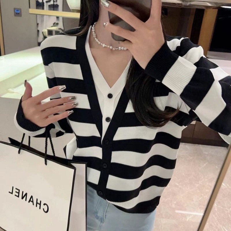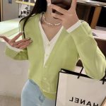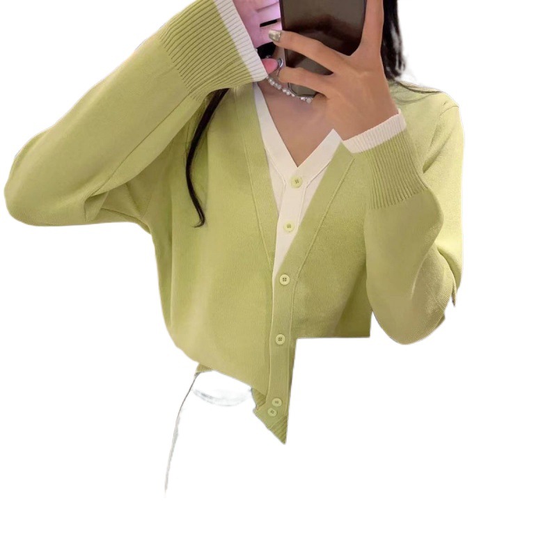 Foreign-style Contrast Color Long-sleeved V-neck Fake Two-piece Knitted Cardigan Women's Thin Sweater Elegant 2023 Early Spring New Top