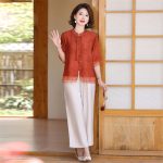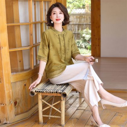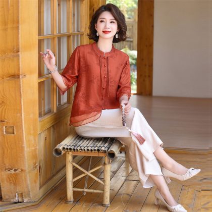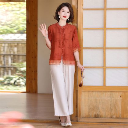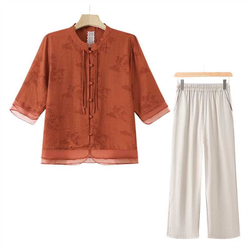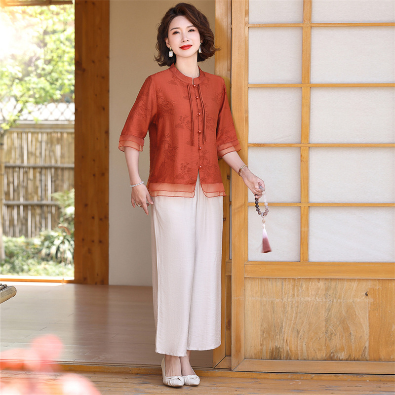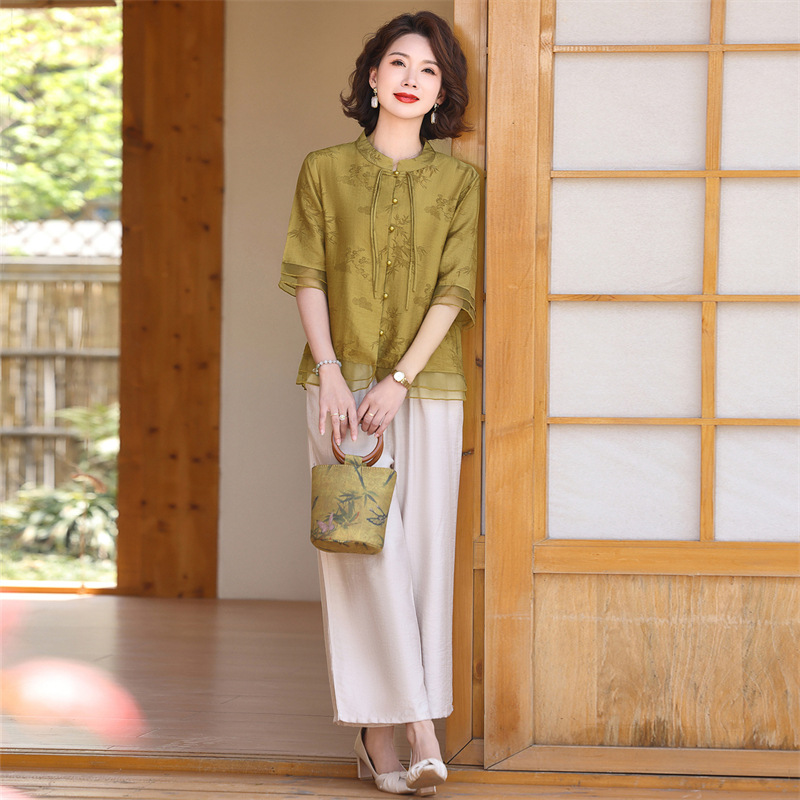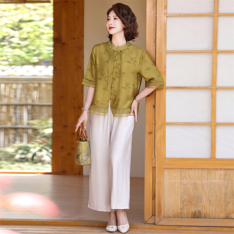 | nameOriginal | Foreign-style Mother Suit Guofeng Stand Collar suit Women's Loose 2024 Summer Middle-aged and Elderly Flesh-covered Slim Shirt Two-piece Set |