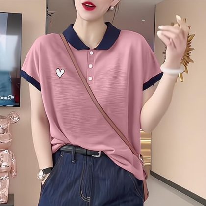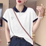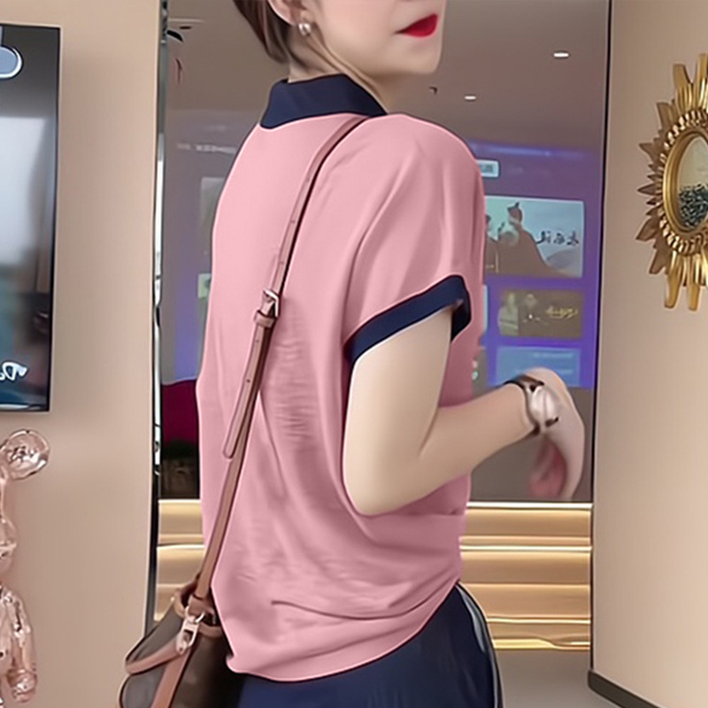 Foreign-style Stitching Contrast Color Women's Slight Fat Shoulder Polo Shirt Short-sleeved 2024 Spring Casual Top Clothes