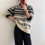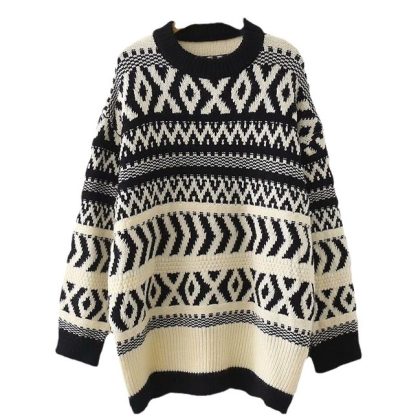 التجارة الخارجية الخريف والشتاء الكورية نمط تصميم تحسس المتخصصة Crewneck سترة المرأة عطلة فضفاضة هندسية البلوز محبوك سترة