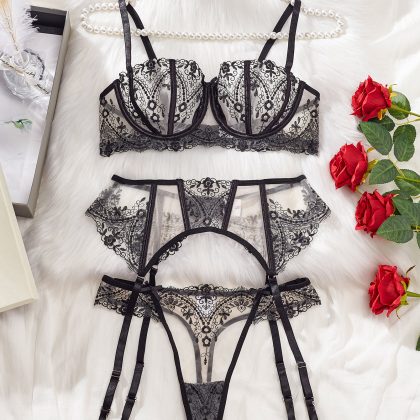 Foreign trade supply 2024 summer new flower embroidery pick-up perspective mesh sexy underwear three-piece women