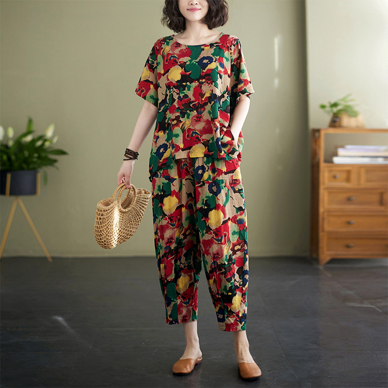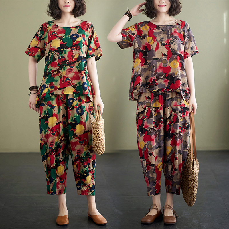 | nameOriginal | Foreign Trade Women's Real Shot 2024 Summer New Printed Cotton and Linen Women's Slimming Top High Waist Harlan Pants Two-piece Set |