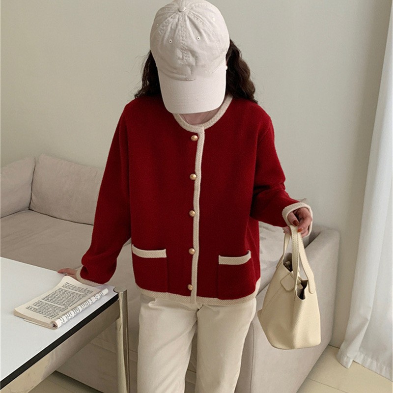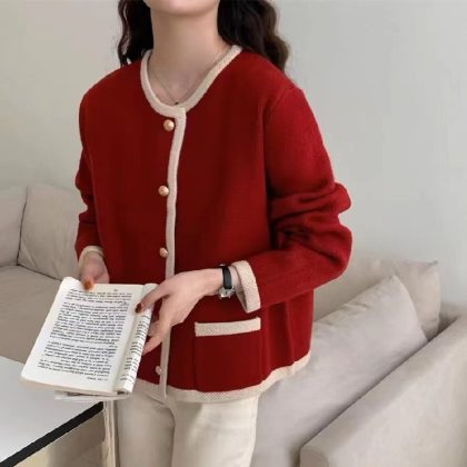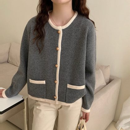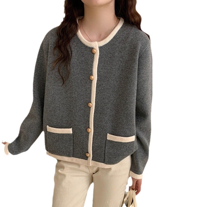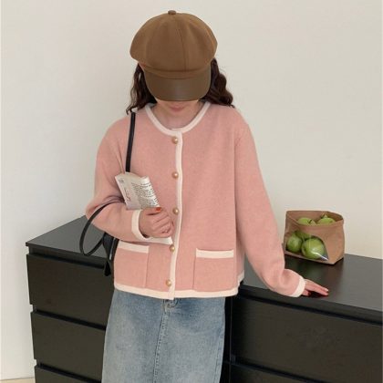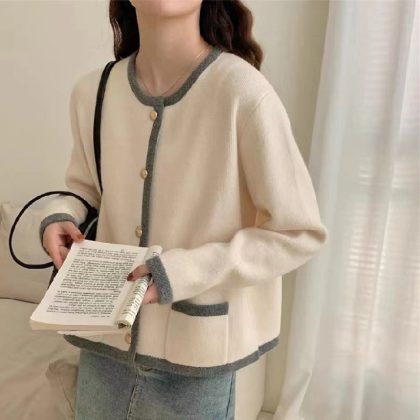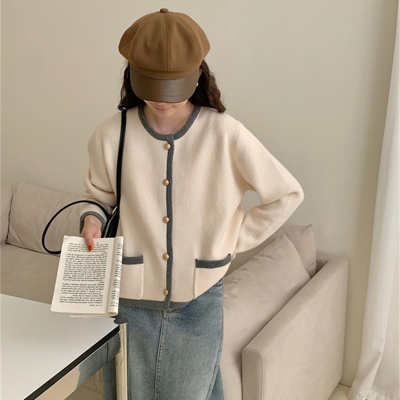 French Chanel style color matching short sweater coat women's loose temperament knitted retro round neck top coat cardigan