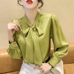 الفرنسية الشيفون قميص المرأة 2023 ربيع جديد أنيق أزياء من الدانتل متابعة الأخضر قميص القوس نفخة كم أعلى