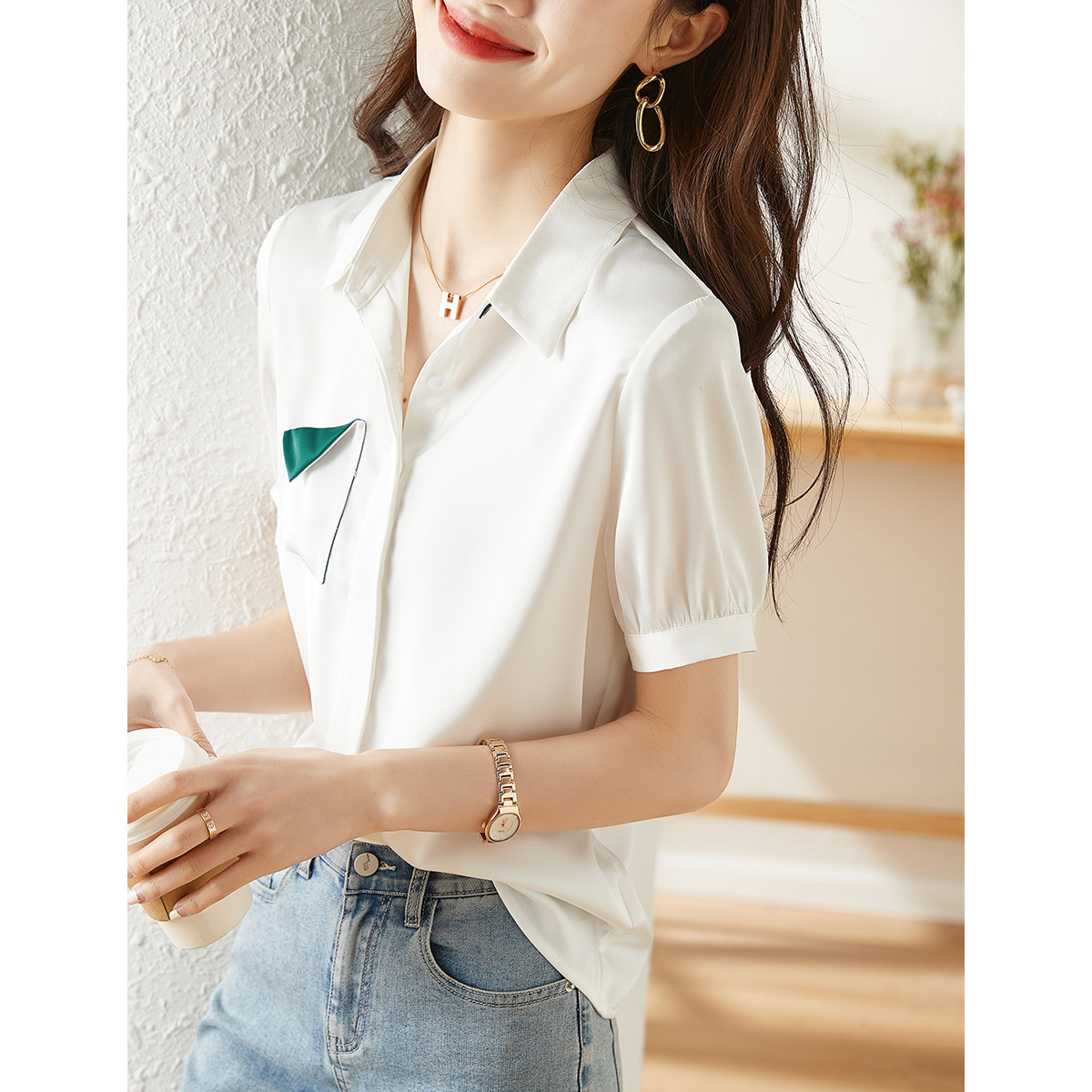 | nameOriginal | French Chiffon Top Contrast Color Pocket Simple Shirt 2024 Summer Short-sleeved Fashionable Commuting All-match Women's Shirt |