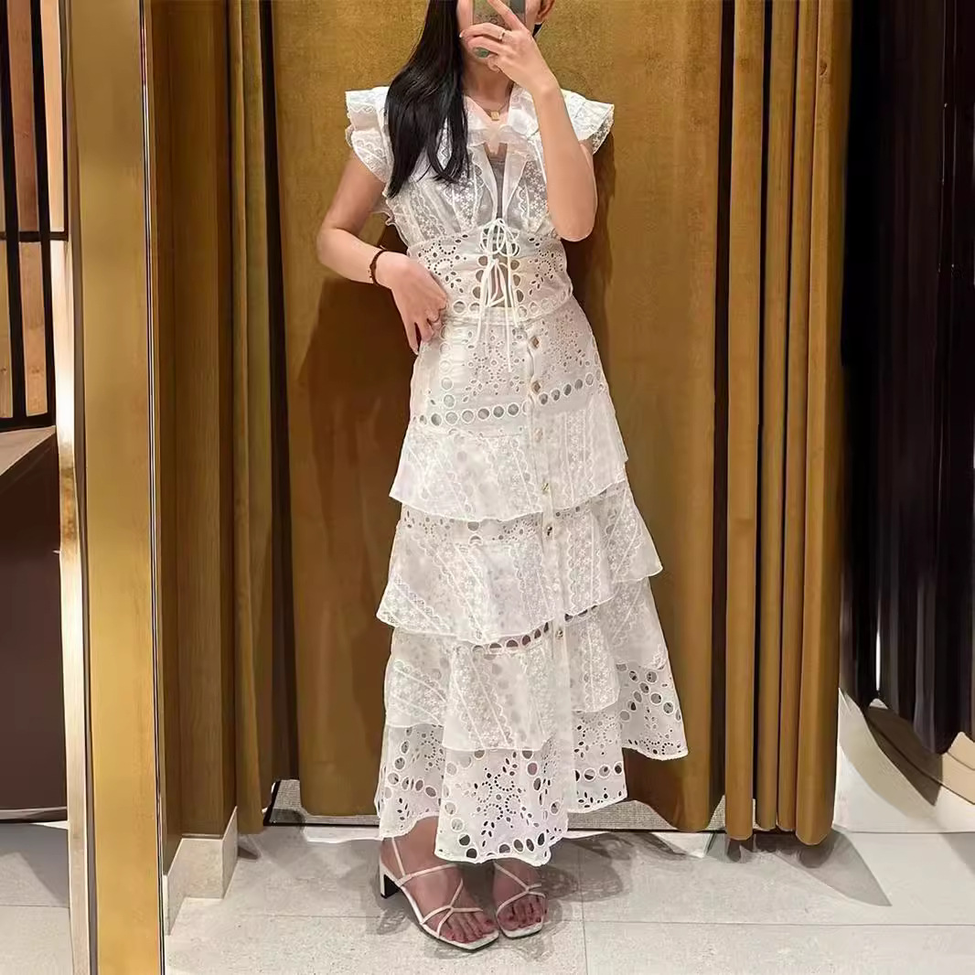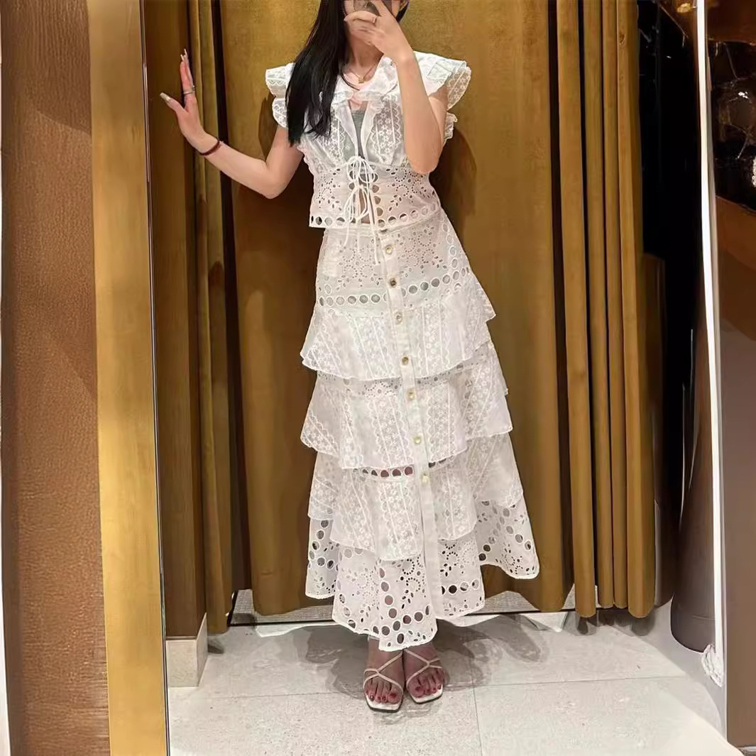 | nameOriginal | French Elegant 24 Summer New Holiday Age-reducing Lace Hollow Ruffled Strap Shirt Top Cake Skirt |