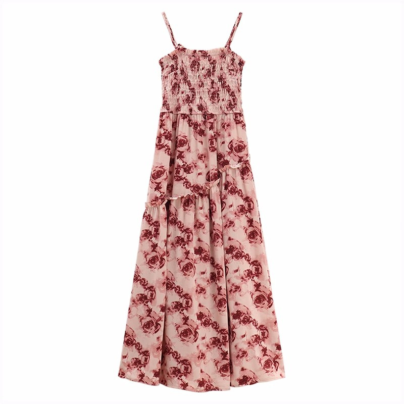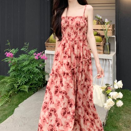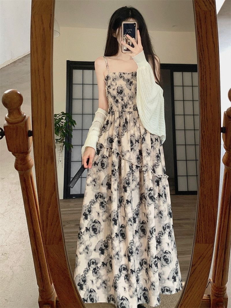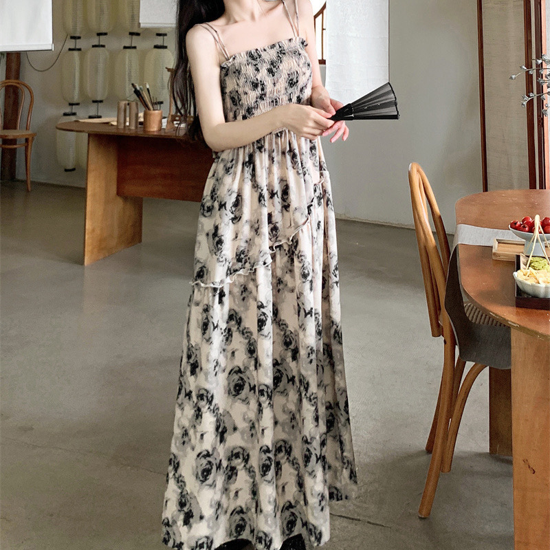 French Hepburn Style Large Size Sling Dress Women's Summer Design Sense Elegant Waisted Black Floral Midi Dress