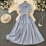 | nameOriginal | French light and mature style small flying sleeves striped dress for women 2024 summer waistline A-line slimming temperament shirt skirt |