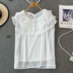 قميص شيفون بتصميم فرنسي متخصص مكشكش للنساء بدلة قميص صيفية جديدة فضفاضة بدون أكمام للتخسيس