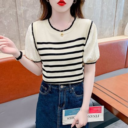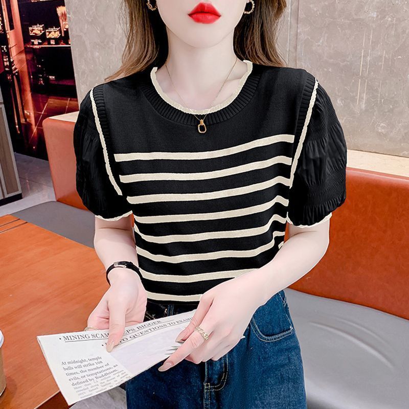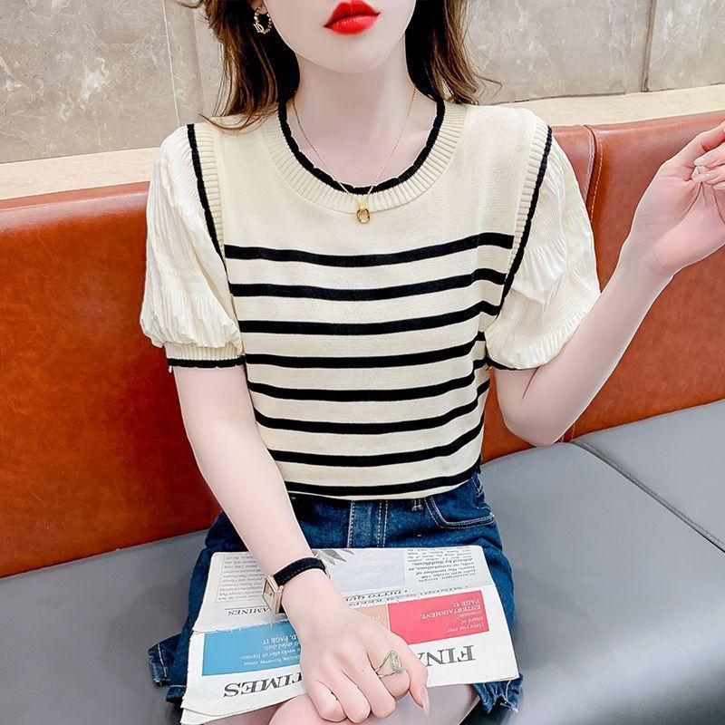 French Puff Sleeve Striped Knitted T-shirt Women's Summer 2024 New Fake Two-piece Elegant All-match Short-sleeve Top