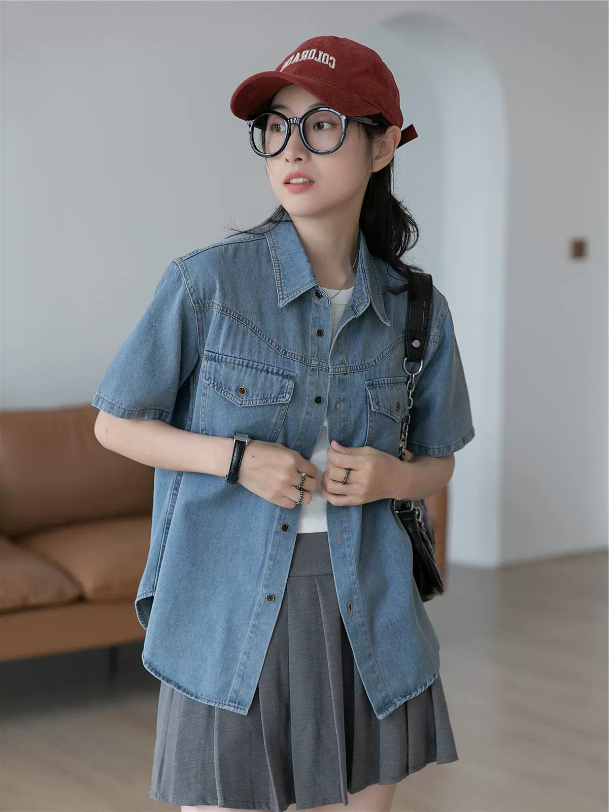 French retro denim short-sleeved shirt for women summer 2024 new Hong Kong style small thin shirt shoulder top