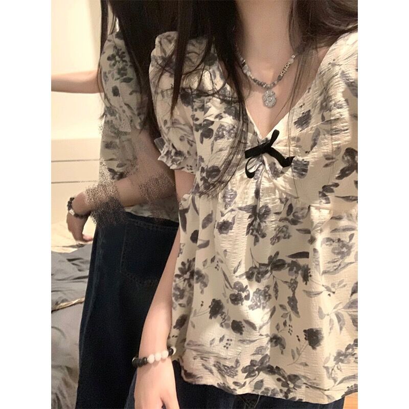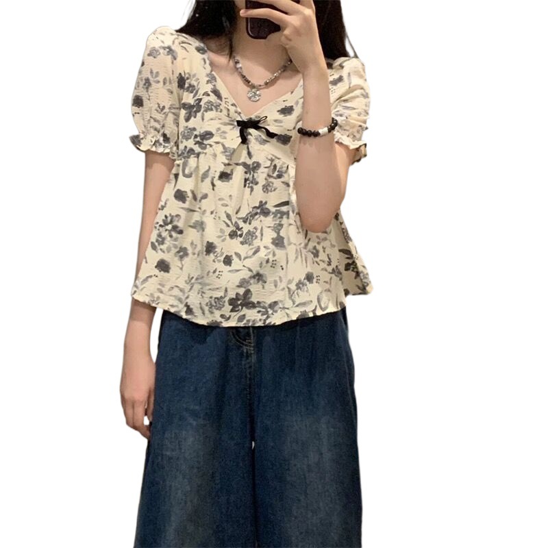 | nameOriginal | French Retro Ink Floral Bubble Short-sleeved Shirt Women's Summer Chic Fresh Sweet Short Doll Shirt Top |