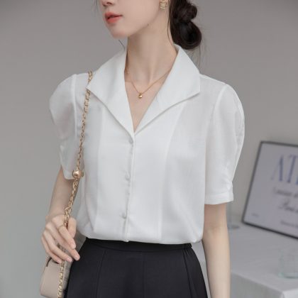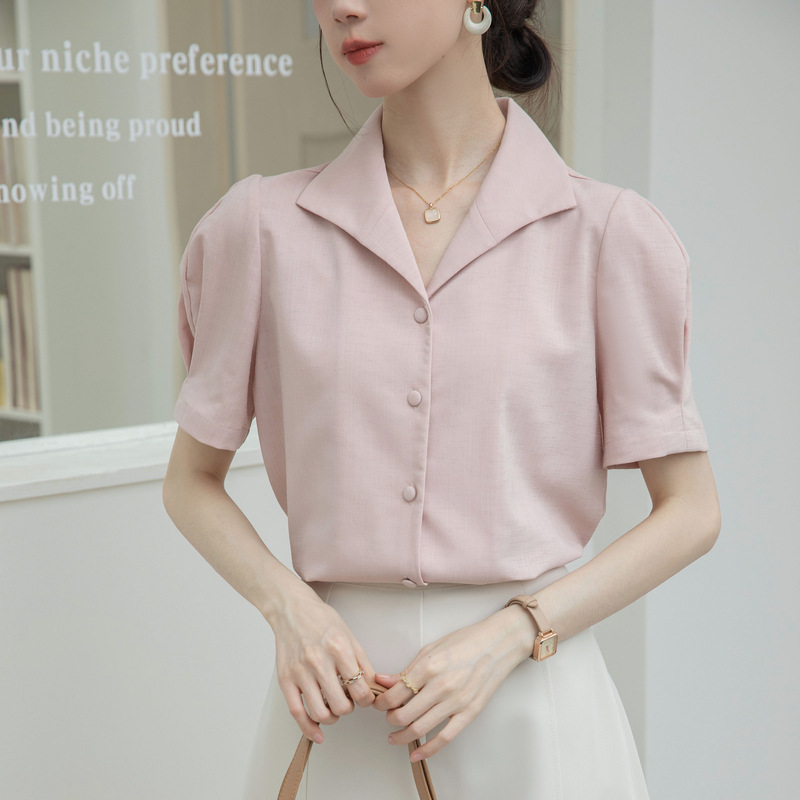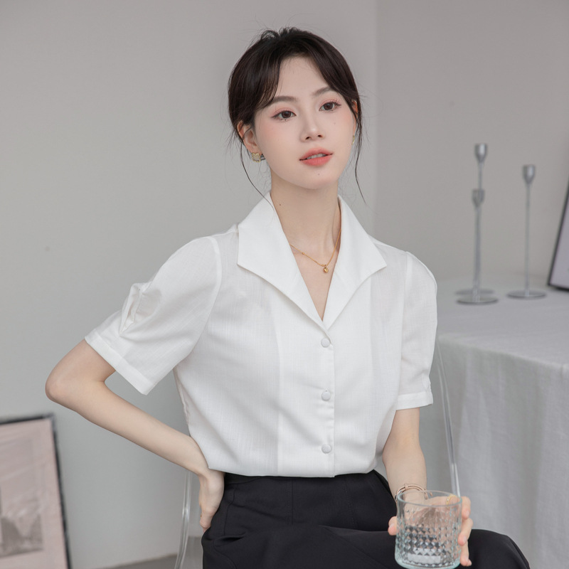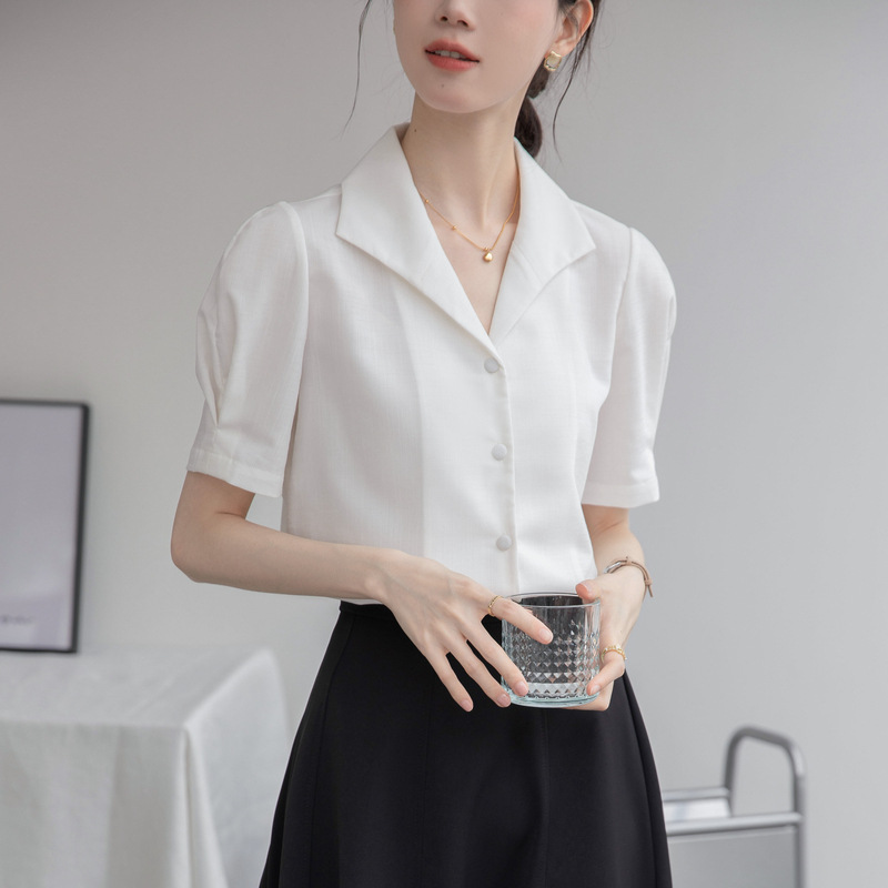 الفرنسية الرجعية قصيرة الأكمام قميص المرأة 2024 الصيف جديد الركاب المهنية بسيطة الأزياء واحدة الصدر الخامس الرقبة قميص