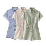 French Retro Style Lapel Multi-button Short-sleeve Denim Jumpsuit Tight Waist All-match Jumpsuit Denim Shorts