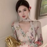 | nameOriginal | French retro V-neck long-sleeved printed mesh T-shirt women's autumn slim-fit short chic beautiful bottoming shirt top |