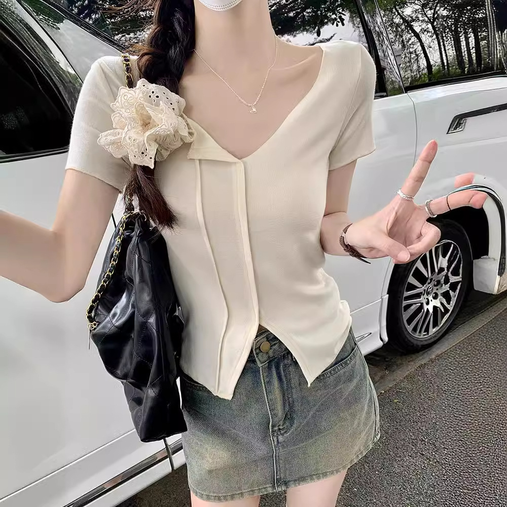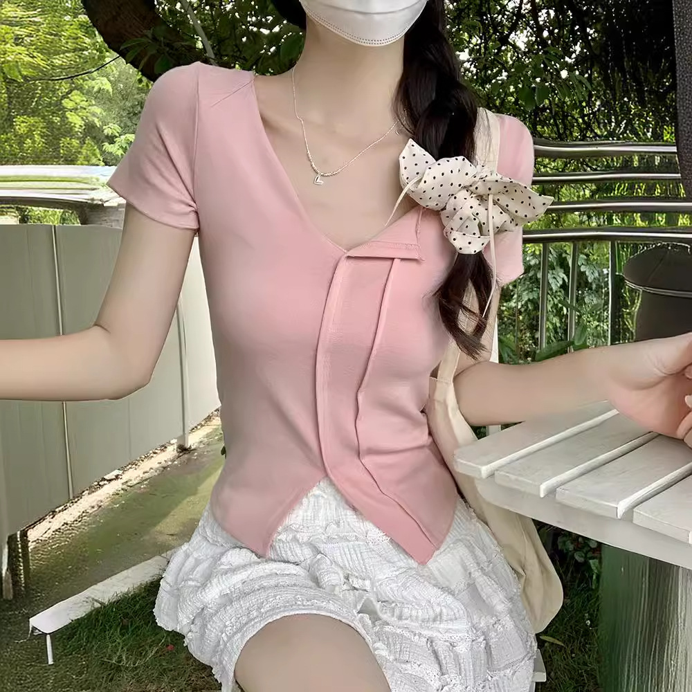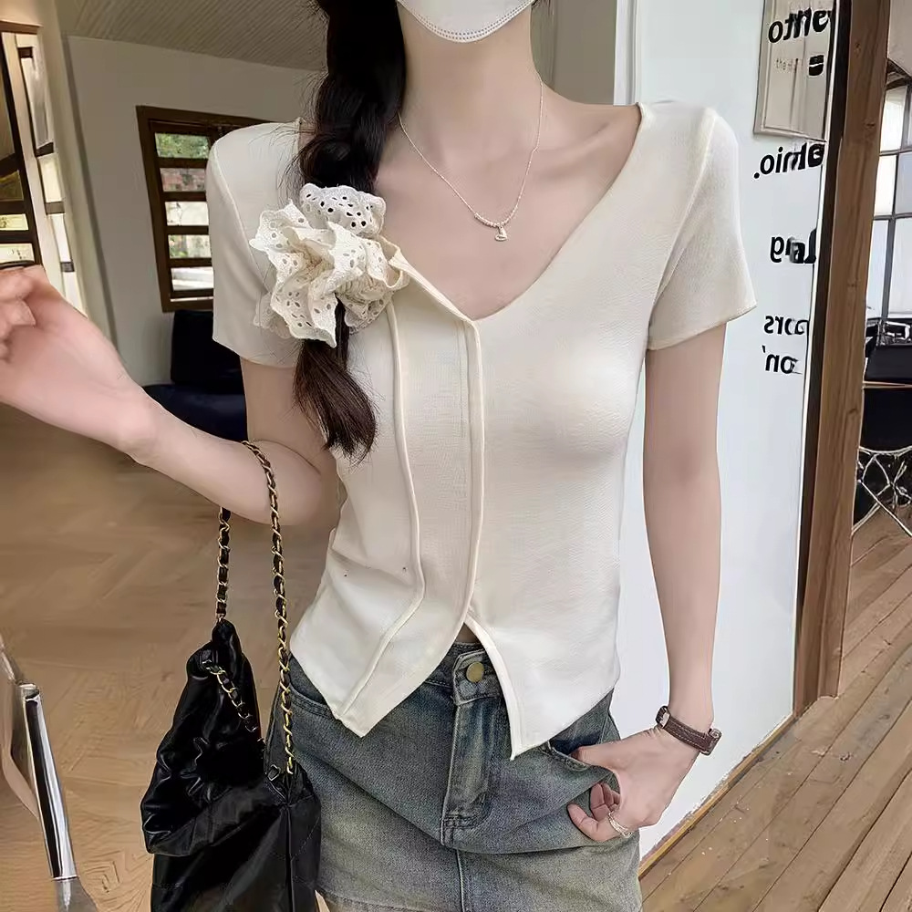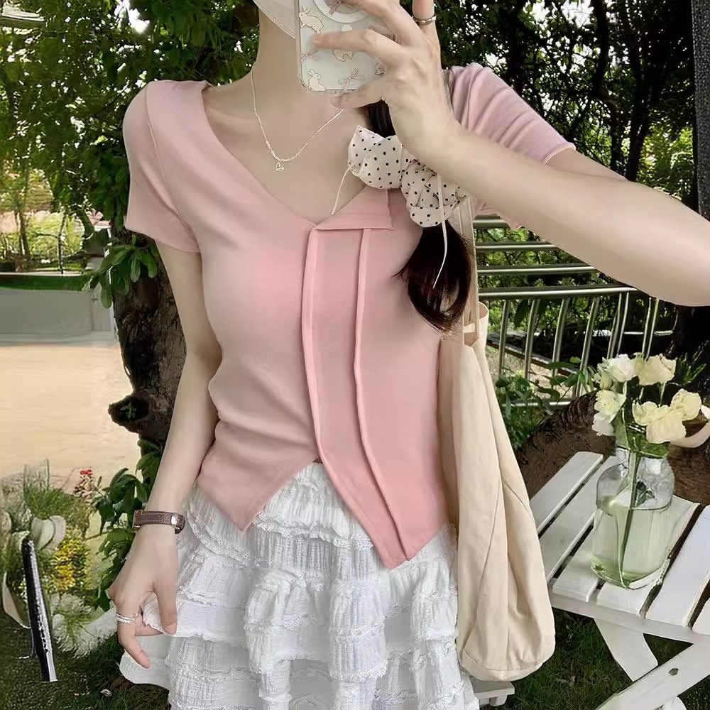 | nameOriginal | French Short-sleeved T-shirt Women's 2024 Summer New Slim-fit Slimming Western-style Sweet and Hot Top Design Top |