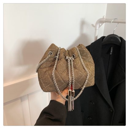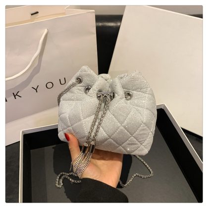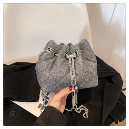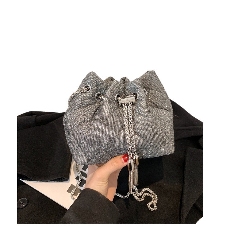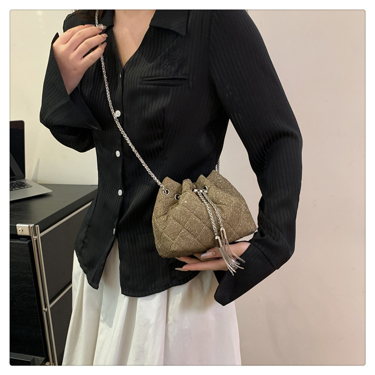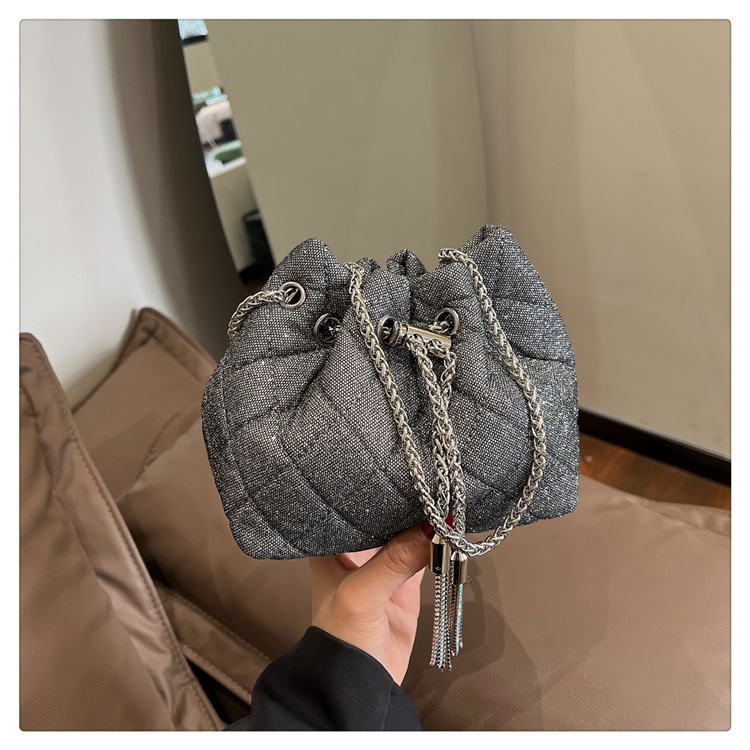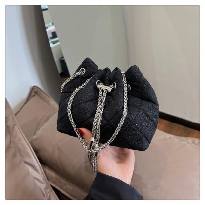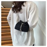 French style high-grade black bucket messenger bag chain saddle bag casual shoulder bag texture solid color thin flash bag