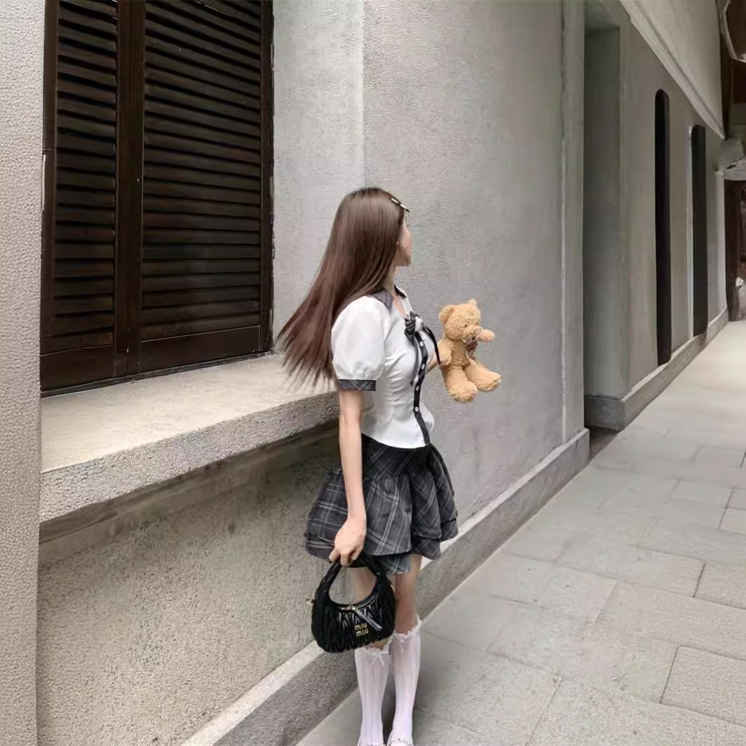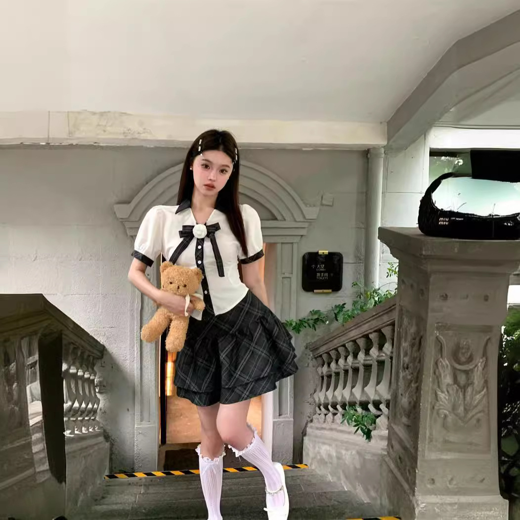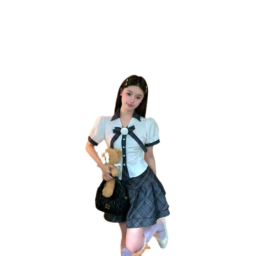 | nameOriginal | French Style Hot Girl suit Women's Bow Slim Shirt Top 2024 Summer High Waist Plaid Skirt Two-Piece Set |