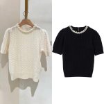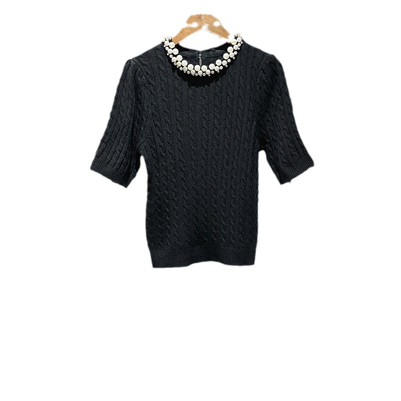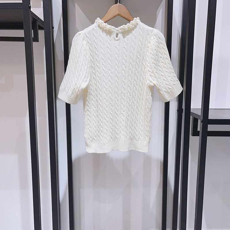 | nameOriginal | French style niche 2024 spring and summer handmade pearl trim collar puff sleeve twisted waist round neck sweater 24031 |