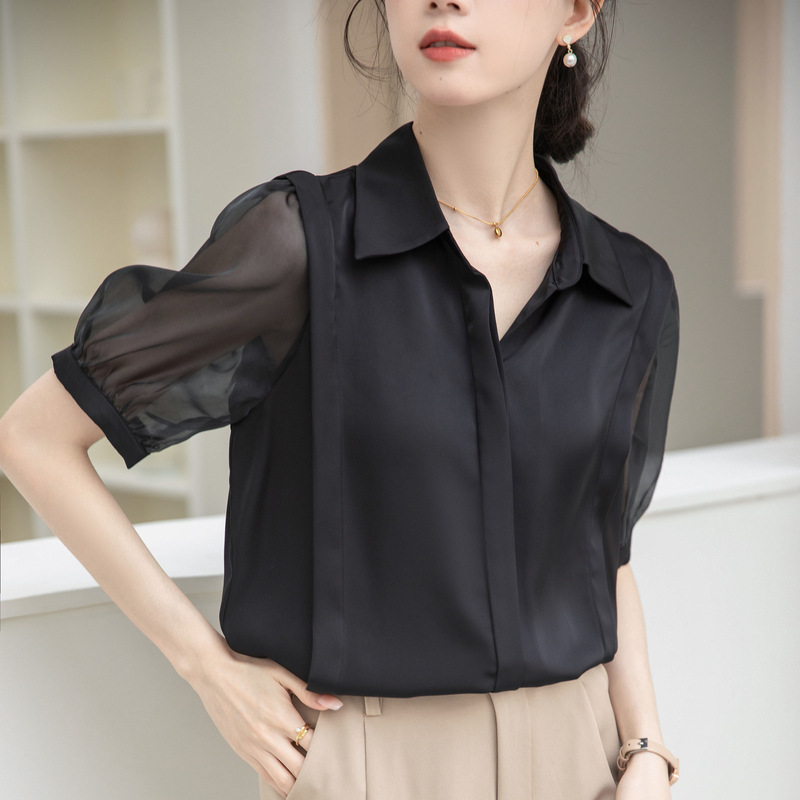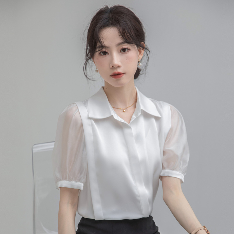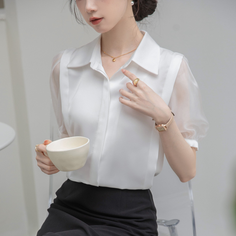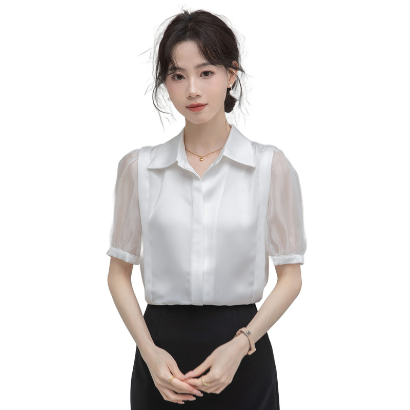 | nameOriginal | French V-neck Satin Shirt Women's 2023 New Summer Professional Commuting Simple Solid Color Puff Sleeve Short-sleeved Top |