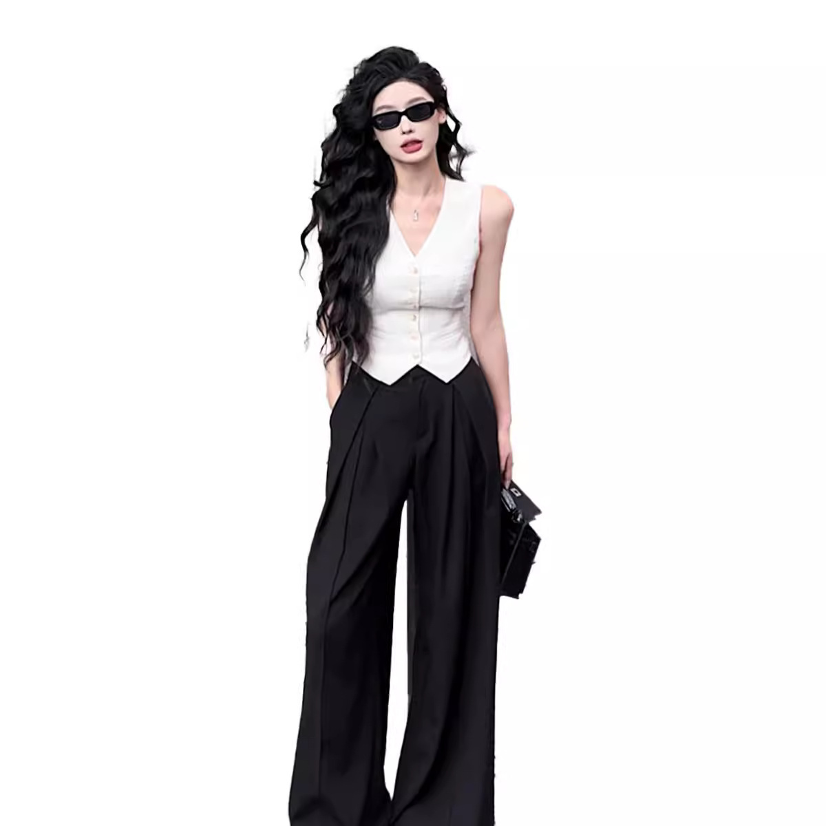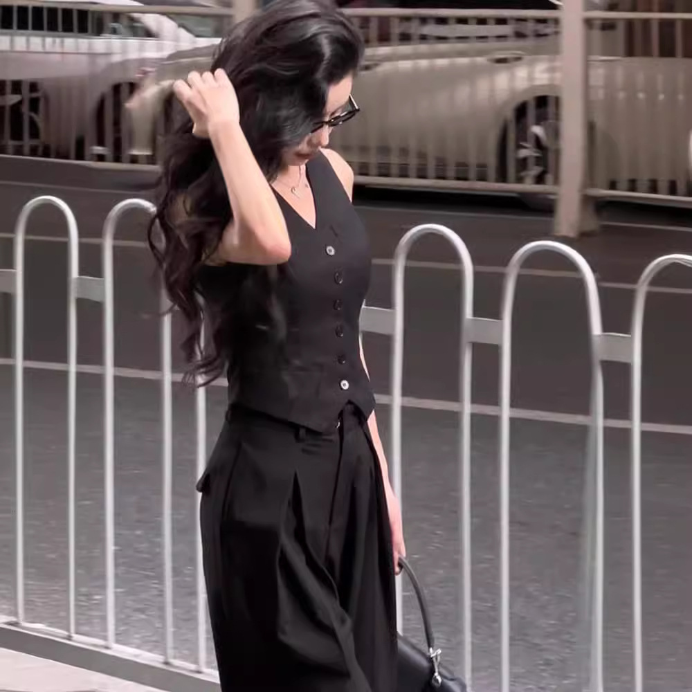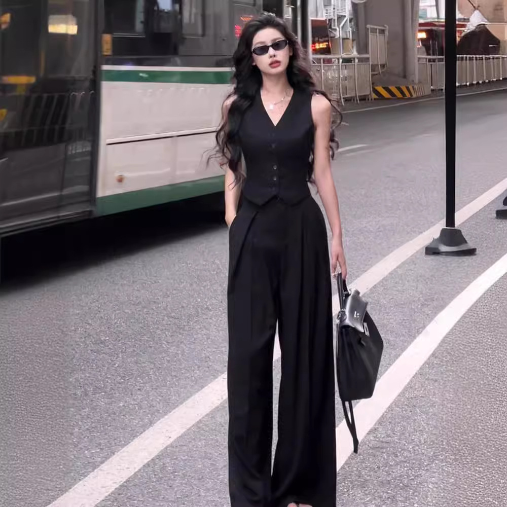 Fried Street Age-reducing Western Style Fashionable suit Women's Summer Spice Girls Slight Fat Slimming Meat-covered Vest Wide-leg Suit Pants Two-piece Set