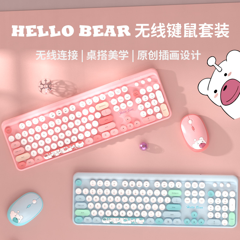 Geezer wireless 2.4G hello bear cute girl round key color keyboard mouse suit office